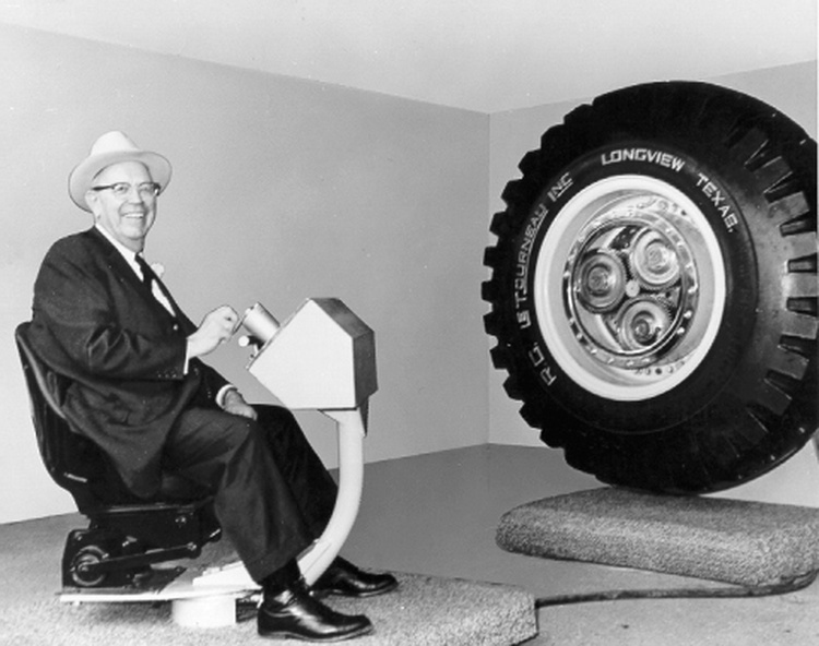All this, along with LeTourneau’s ingenuity, culminated in a lucrative manufacturing business and many new designs of earthmoving vehicles. The imagination with which LeTourneau pursued his love for designing new machines is often recalled by others as having transcended that of “ordinary men.” He had hundreds of patents during his lifetime, and was the maker of almost 300 inventions. He introduced the rubber tire into the earth-moving industry, invented and developed the Electric Wheel, pioneered the welding of several metals, and built large mobile offshore drilling platforms. He even made cranes to move crashed fighters and bombers on aircraft carriers and on land. LeTourneau’s machines accounted for nearly three quarters of the earthmoving machines during WWII.